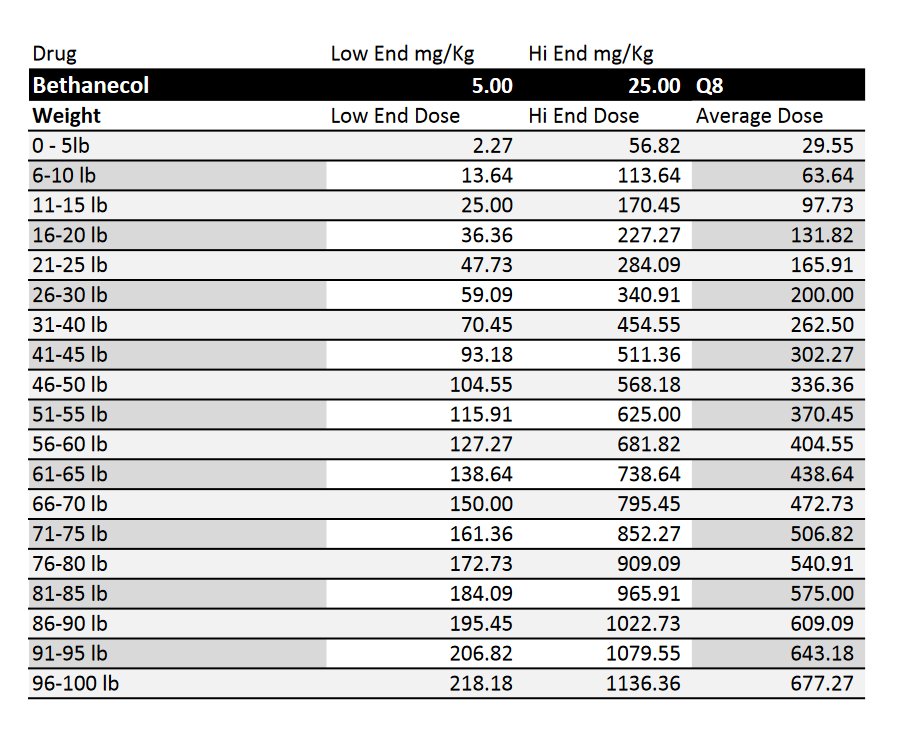 Bethanecol November 2, 2020 Drug Dosages Dog 5-25mg total dose PO Q8 Cat dose is 1.25 – 5.0mg/CAT Available in 5,10, 25 and 50mg tablets Chart: Dog Dose Q8