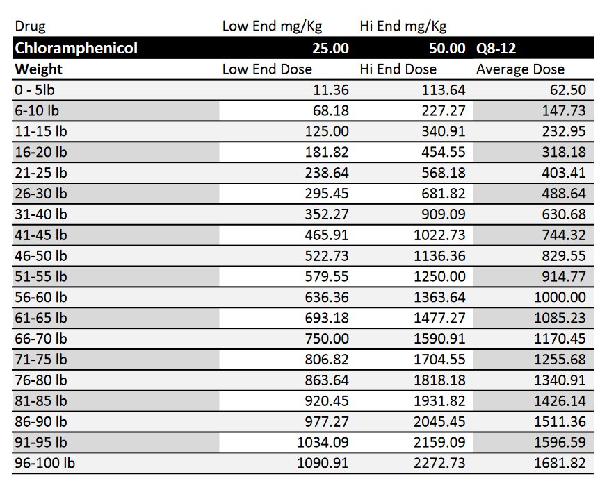 Chloramphenicol November 2, 2020 Drug Dosages Dog 20-30mg/lb PO Q8 Cat 50mg total PO Q12 Cat dose is exactly HALF the dog dose.