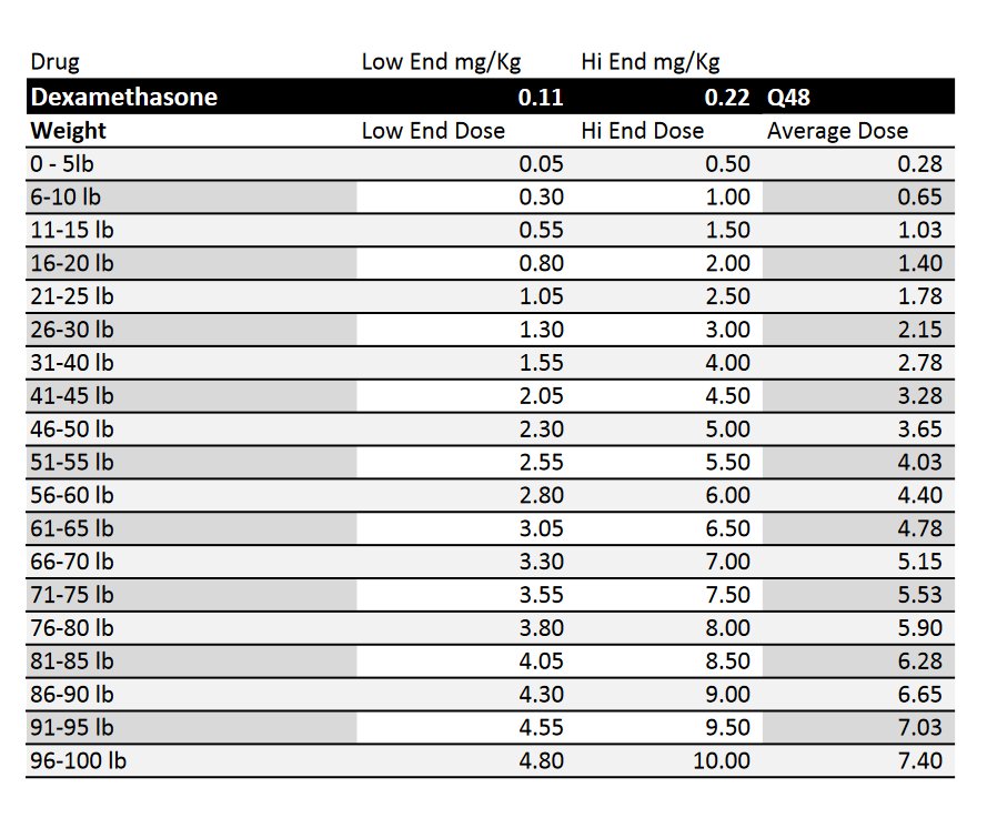 In this chart for dog and cat, the higher dose is for brain trauma and pemphigus while the lower dose is for anti-inflammatory processes.
