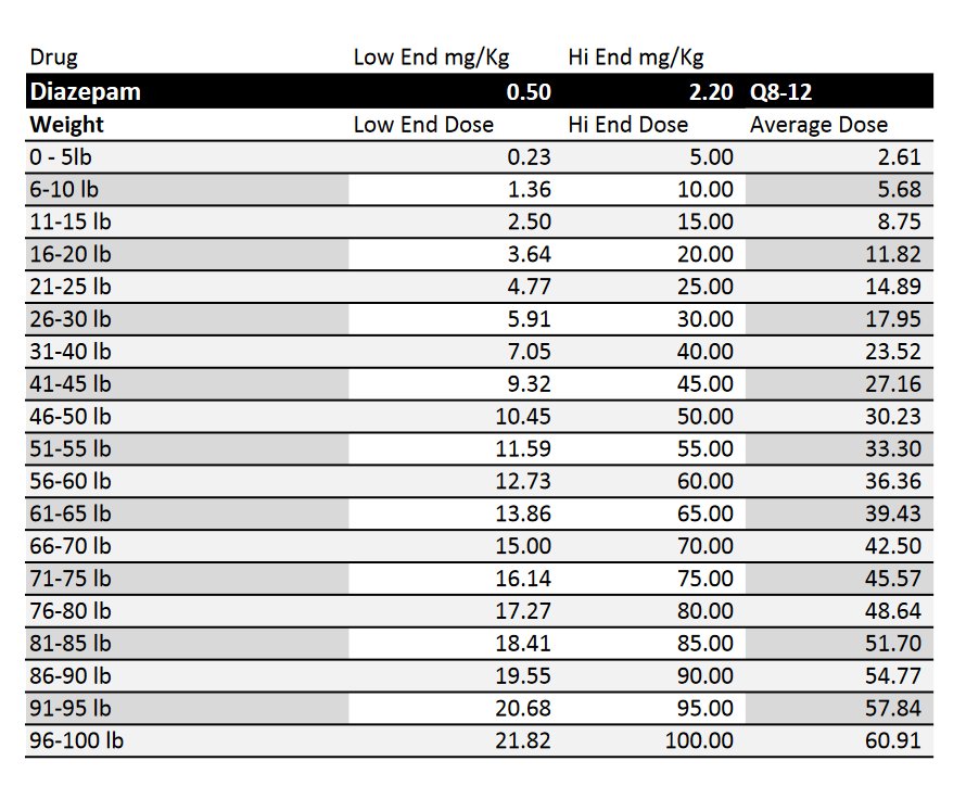 Diazepam November 2, 2020 Drug Dosages Dog: 0.5mg to 1.0mg/lb PO Q8 Cat: 0.25 to 1.0mg/lb PO Q8 Can wreck a cat liver rarely. 5mg and 10mg tablets