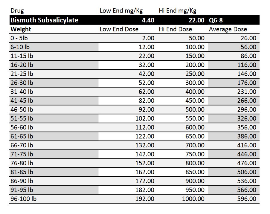 Kao-Pectate November 2, 2020 Drug Dosages Unreasonable to fractionate for kittens Not fab in cats Dog 0.5-1.0 ml/lb PO Q 4-8 or: 1tbsp/15lbs