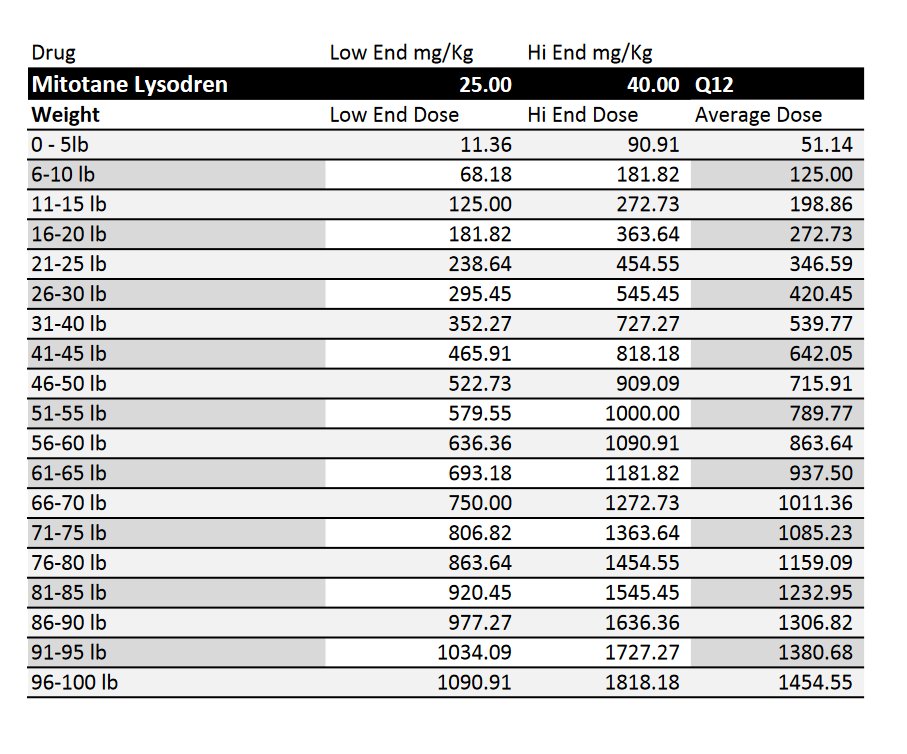 Mitotane Lysodren November 2, 2020 Drug Dosages Dog: 15-20mg/lb PO Q12 x 5-10 days then 15mg/lb Q24 every 3rd day. Available in 500mg tablets Cat: 25-50mg/cat