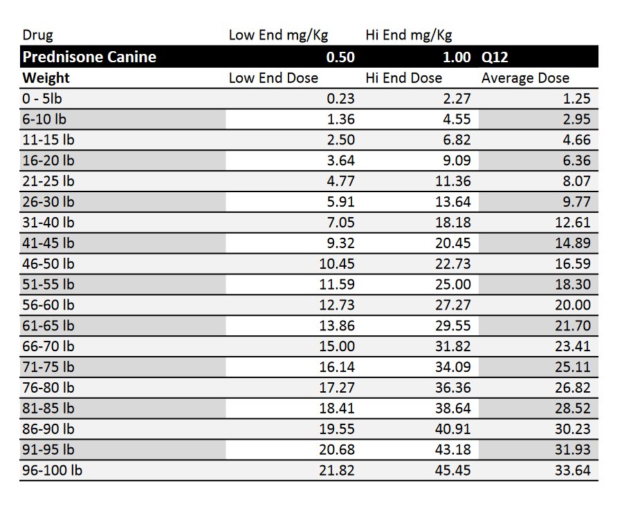 Prednisone November 2, 2020 Drug Dosages Dog Low Dose 0.25 to 0.50mg/lb Double the chart’s dose for Immune Suppression, fistulas, AIHA, Lymphoma