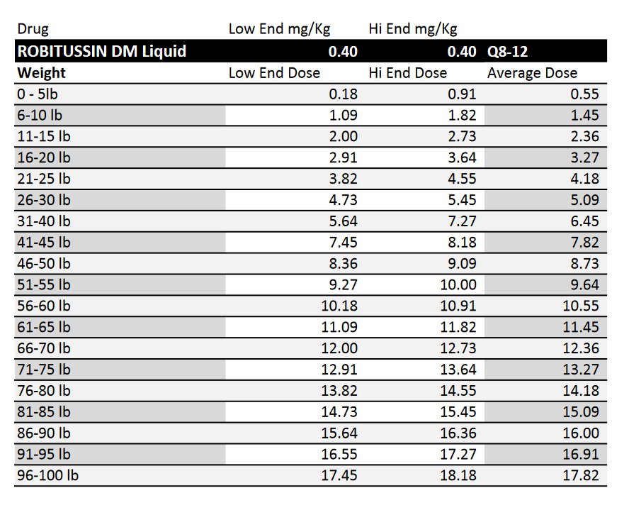 Robitussin DM November 2, 2020 Drug Dosages Guaifenesin, Dextromethorphan Dog: 1ml/5lb PO Q12 Dog: 2cc/10lb PO Q12 Chart dose in milliliters